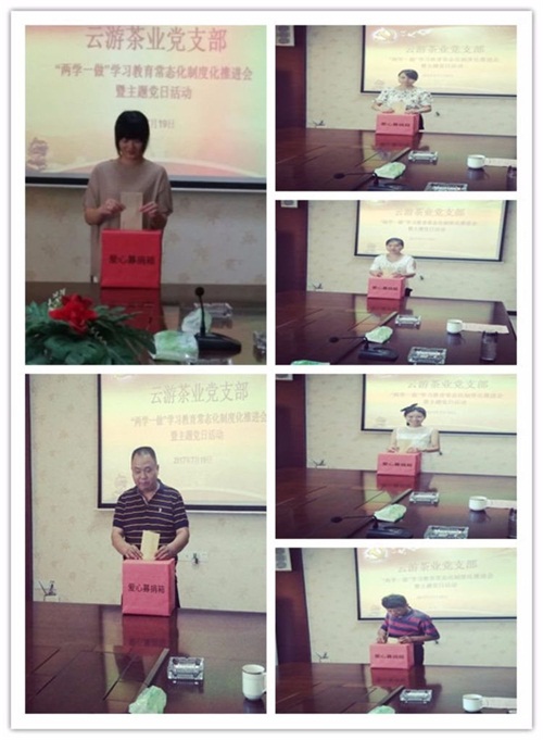 2017年7月19日,云游茶業(yè)黨支部召開(kāi)“兩學(xué)一做”學(xué)習(xí)教育常態(tài)化制度化推進(jìn)會(huì)及主題黨日活動(dòng),向?yàn)?zāi)區(qū)人民愛(ài)心募捐作為會(huì)議的一項(xiàng)重要議程進(jìn)行。在公司董事長(zhǎng)楊正武、黨支部書(shū)記楊應(yīng)輝的指導(dǎo)下,黨員們積極參與、慷慨解囊,共募集愛(ài)心款1萬(wàn)元,全部轉(zhuǎn)賬給長(zhǎng)沙市望城區(qū)雷鋒慈善會(huì),用于災(zāi)區(qū)人民災(zāi)后重建工作。